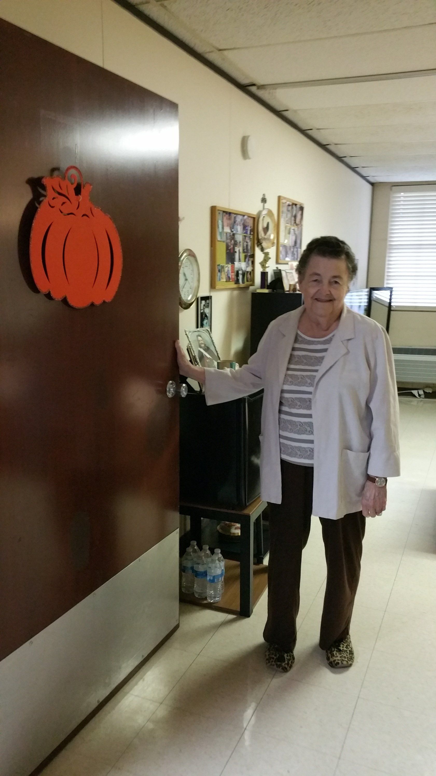 This resident proudly opens her pumpkin adorned door to give a tour of her home.