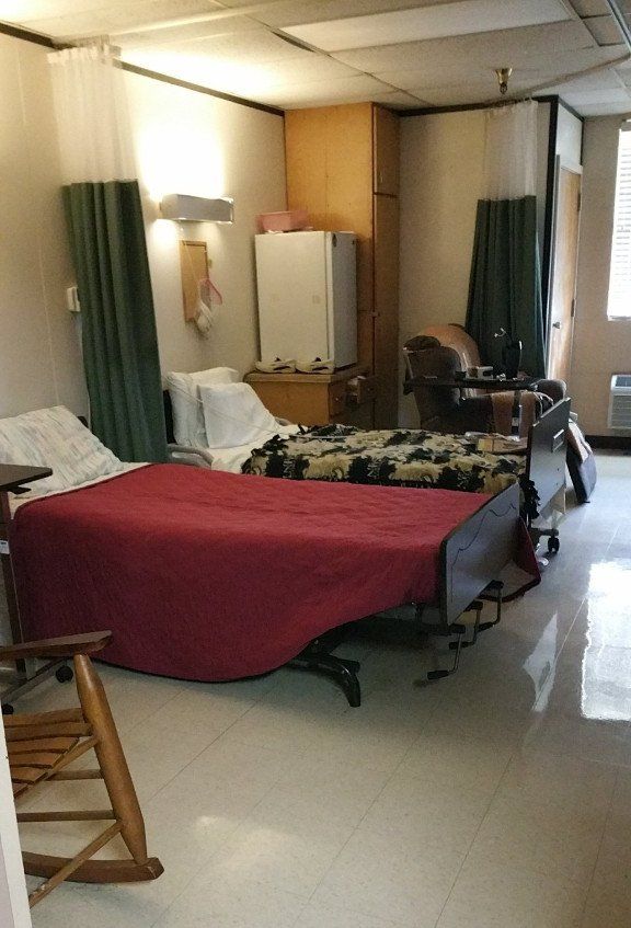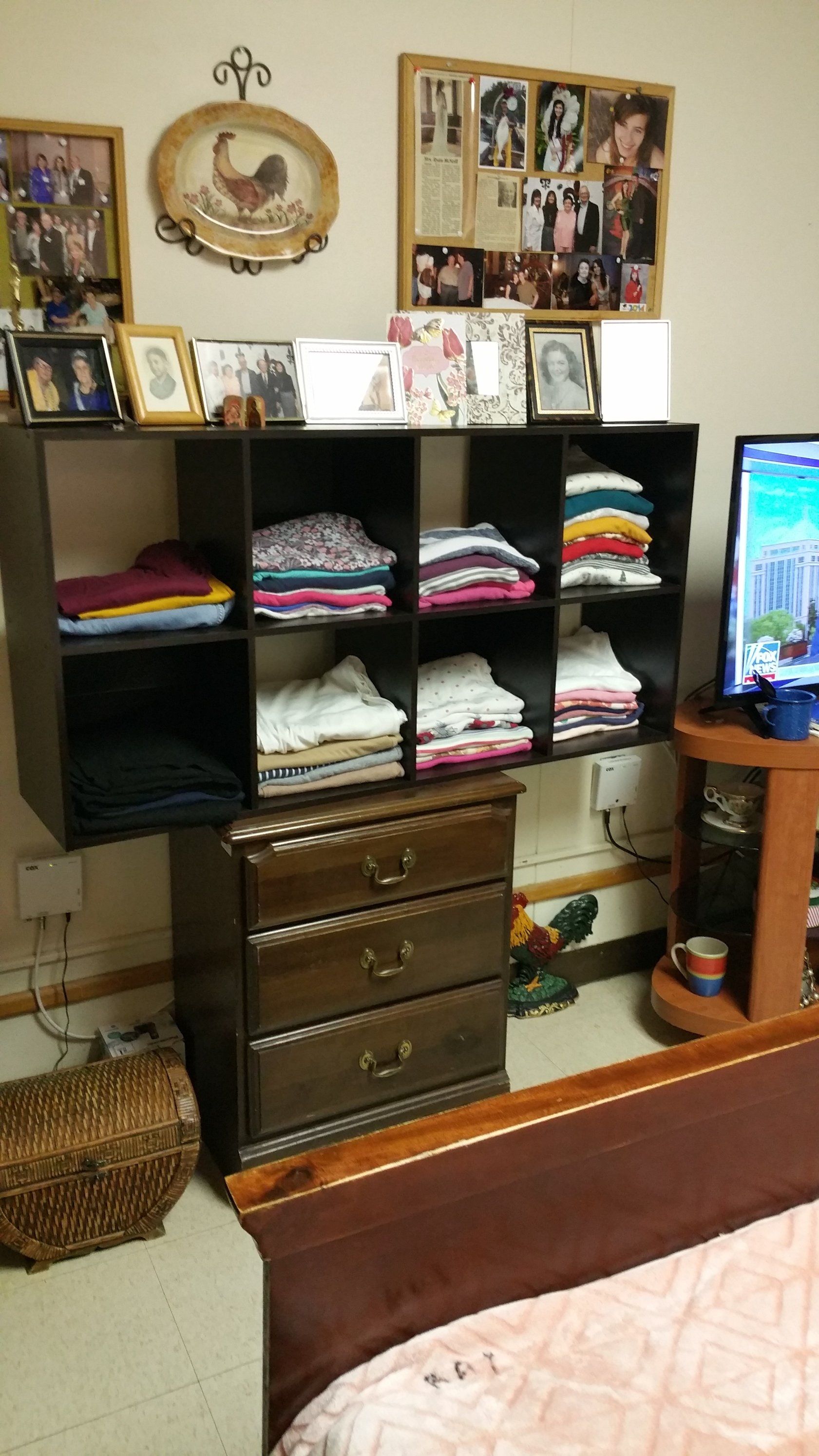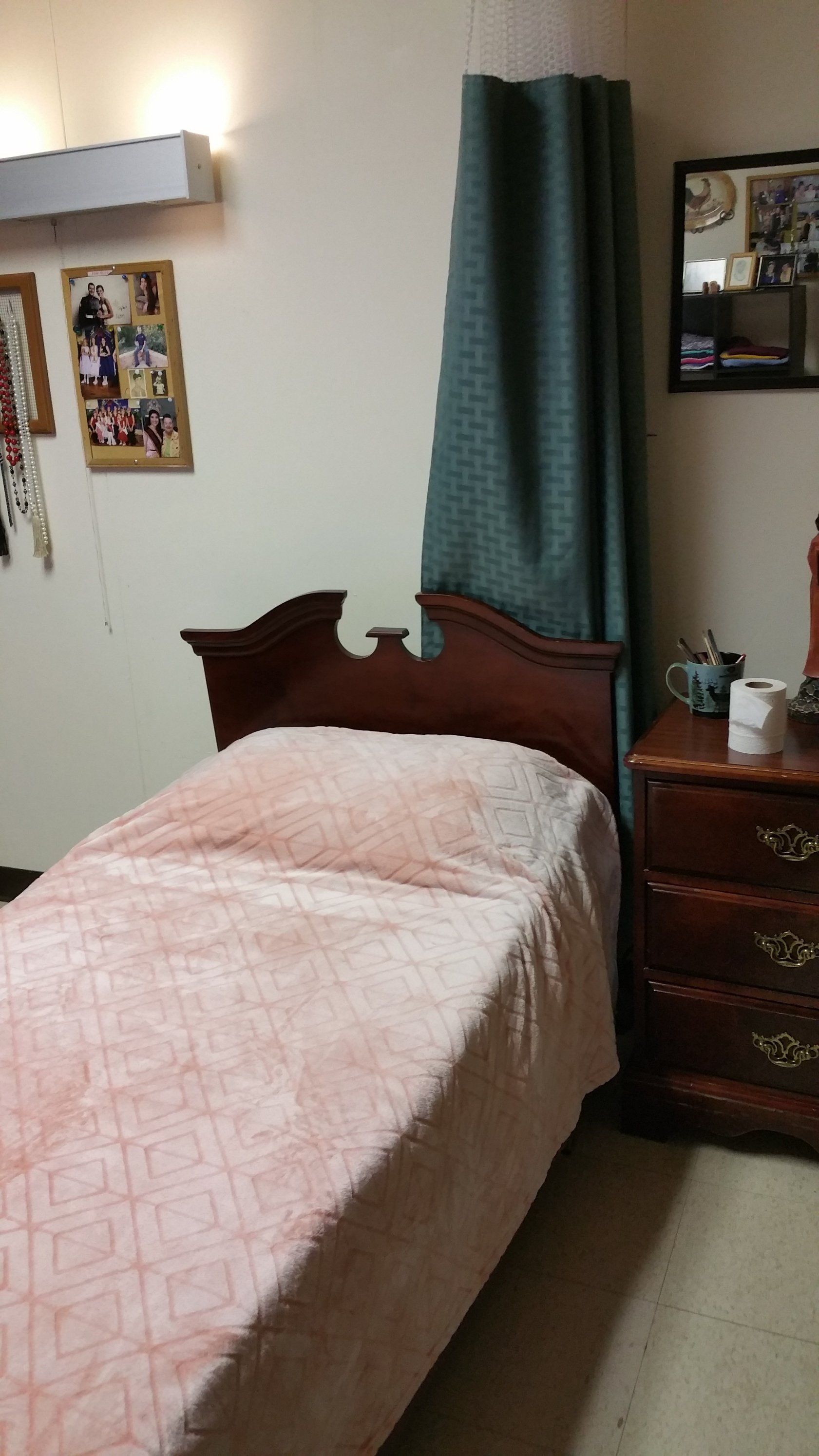 Comfortably at home in her private room, this resident loves to show off her spacious room.